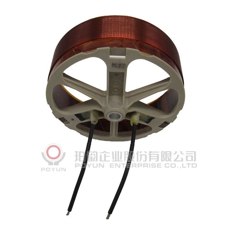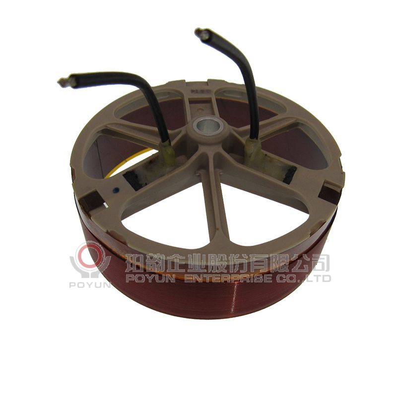 扁綫音圈粘合支架,一層立繞,引綫用銅片引出后再接加黑色絕緣套管的錦絲綫。 BOBBIN: Polyimide 綫材:1-ESVR銅扁綫 補强紙:Polyimide